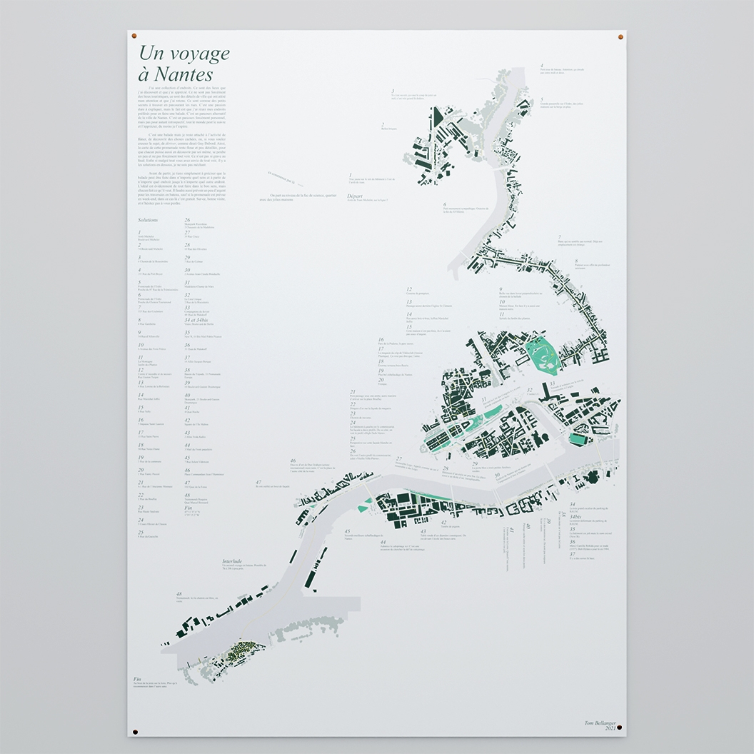 Il existe Le Voyage à Nantes, mais voici une proposition personnelle et indépendante pour un autre parcours de la ville. Cette carte est un catalogue d’endroits Nantais, en même temps un guide et une invitation à la dérive. Cinquante petits secrets, ou simples détails, réunis sur une carte, de manière précise mais pas trop, histoire de ne pas gâcher tout le plaisir de la découverte.